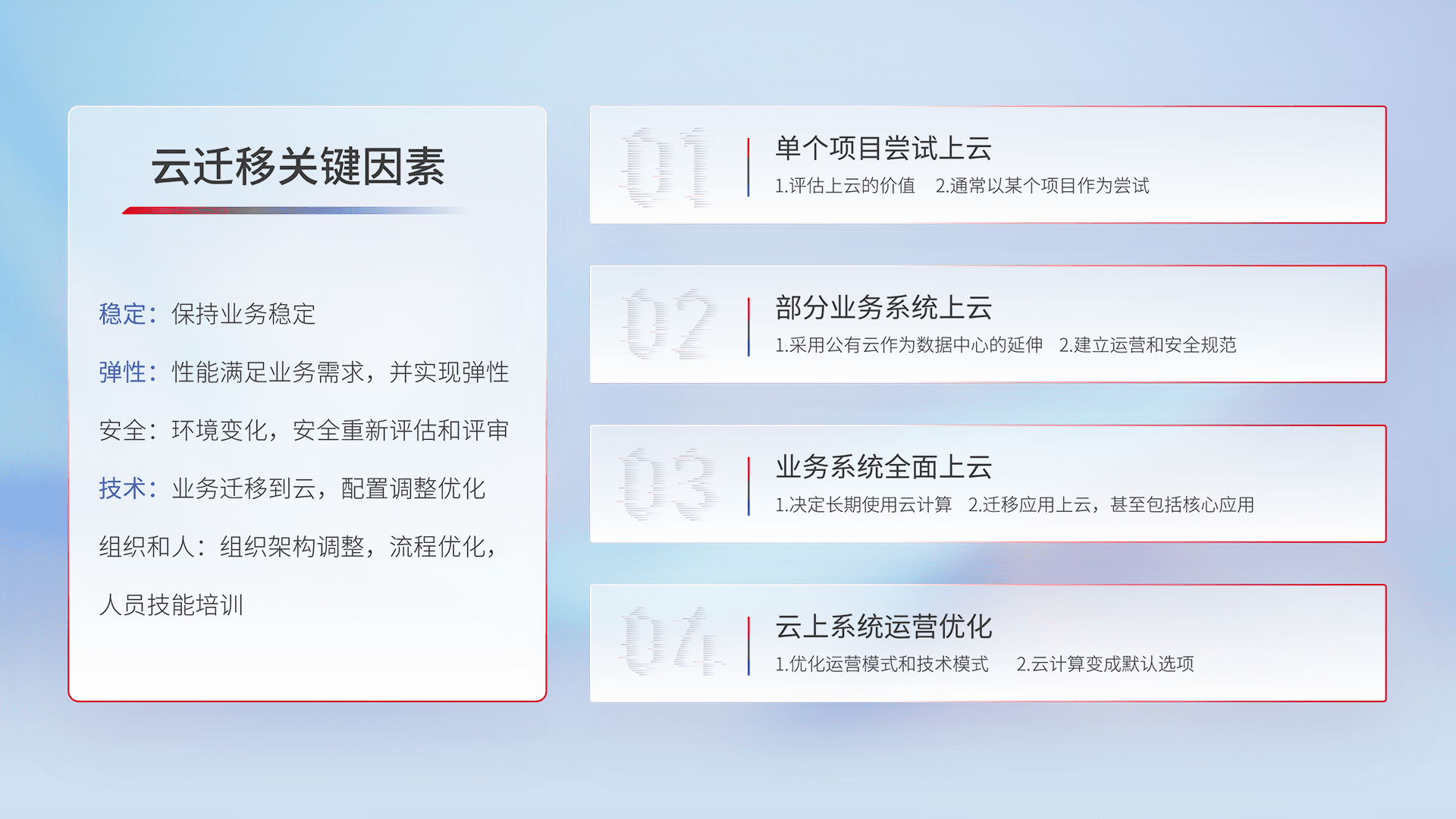 结合实际业务,,,,从规划设计、、、、云平台选型、、、云原生改造、、、数据迁移、、、、集成交付,,迁移全过程为客户识别最佳上云路径,,,做好风险识别管理,,设计网络架构、、、、身份权限、、、、安全审计合规、、、操作审计、、、、日志审计、、、监控告警策略、、、多站点容灾设计等,,对云上基础设施进行整体规划,,提升IT治理水平,,,,以满足弹性、、、、高可用、、高性能的需求。。。。